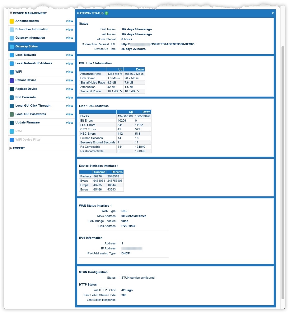Gateway Status provides information about the CPE gateway device for the account, including signal and statistical information you can use for troubleshooting a customer connection. The information available depends on the type of device.