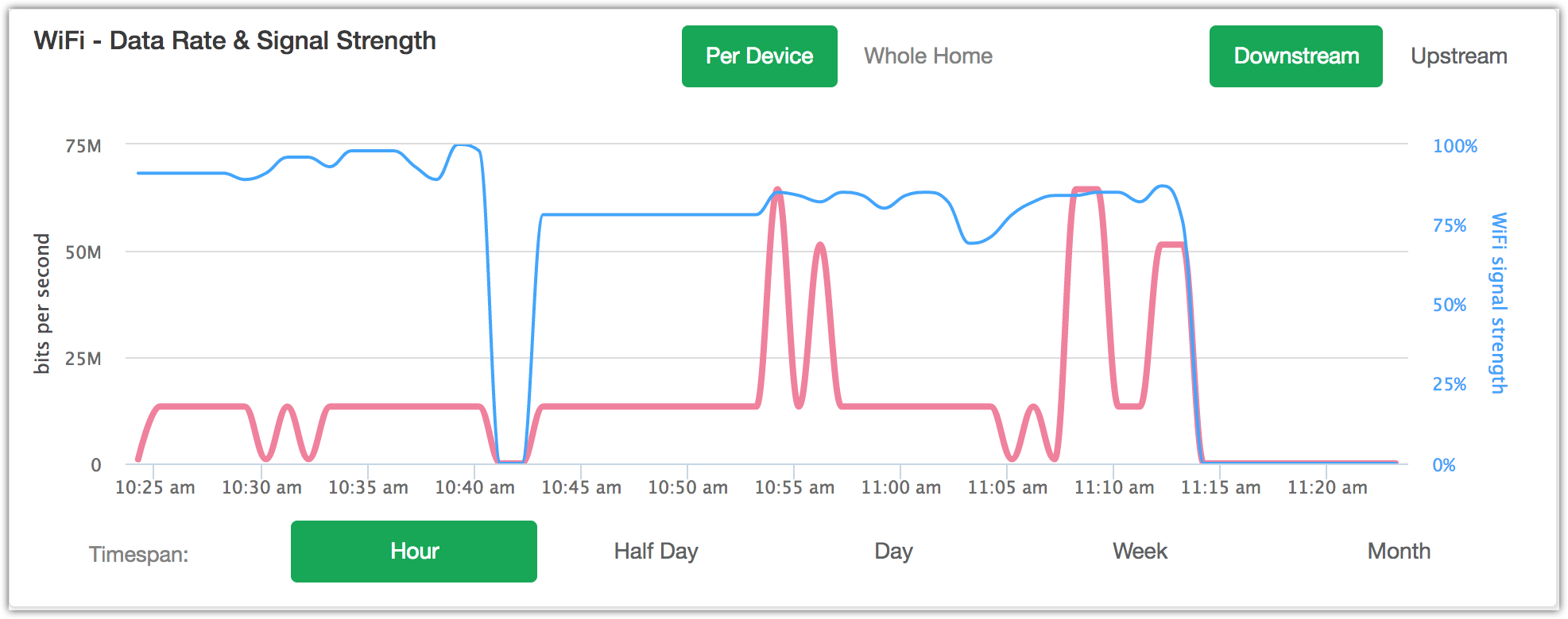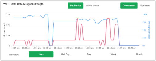 However, at approximately 10:43am, the device comes back online with a data rate of 12Mbps while the signal strength remains good (anything above 50% is usually sufficient for good throughput). The data rate later jumps to 65 Mbps with no appreciable difference in signal strength indicating that the device simply moved closer to the gateway and was able to achieve a higher WiFi data rate. While this image depicts an overall healthy connection, your subscriber complaint scenario graph would be marked by multiple troughs in the throughput and signal strength during the timeframe in question.