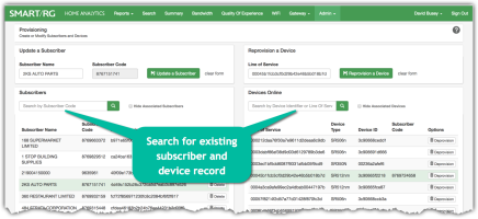 When the time comes to provision stand-alone Subscriber and Device records previously entered into the system, use the Search fields indicated below to locate the desired records. Click on the line item in the found list of records and the contents will be copied to the proper fields in the upper portion of the screen.